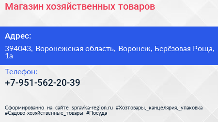 Магазин хозяйственных товаров по адресу 394043, Воронежская область, Воронеж, Берёзовая Роща, 1а в дальнейшем Организация, размещена в следующих категориях: