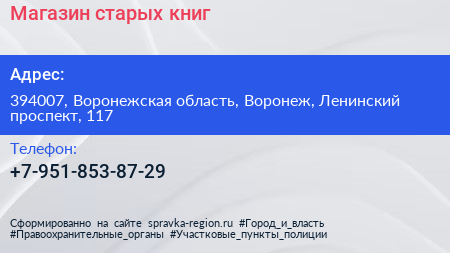 Магазин старых книг по адресу 394007, Воронежская область, Воронеж, Ленинский проспект, 117 в дальнейшем Организация, размещена в следующих категориях: