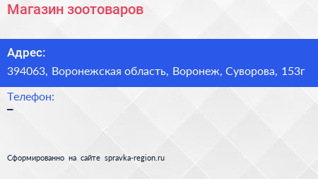 Магазин зоотоваров по адресу 394063, Воронежская область, Воронеж, Суворова, 153г в дальнейшем Организация, размещена в следующих категориях: