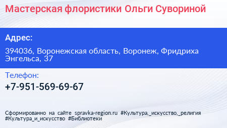 Мастерская флористики Ольги Сувориной по адресу 394036, Воронежская область, Воронеж, Фридриха Энгельса, 37 в дальнейшем Организация, размещена в следующих категориях:
