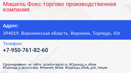 Мишель Фокс, торгово-производственная компания по адресу 394019, Воронежская область, Воронеж, Торпедо, 43г в дальнейшем Организация, размещена в следующих категориях: