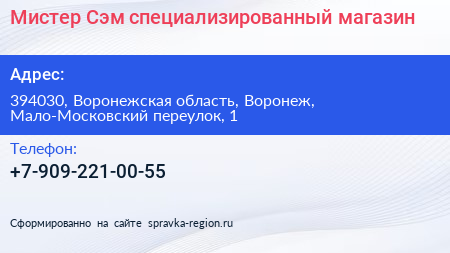 Мистер Сэм, специализированный магазин по адресу 394030, Воронежская область, Воронеж, Мало-Московский переулок, 1 в дальнейшем Организация, размещена в следующих категориях: