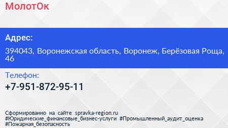 МолотОк по адресу 394043, Воронежская область, Воронеж, Берёзовая Роща, 46 в дальнейшем Организация, размещена в следующих категориях: