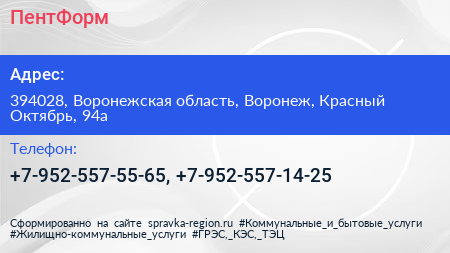 ПентФорм по адресу 394028, Воронежская область, Воронеж, Красный Октябрь, 94а в дальнейшем Организация, размещена в следующих категориях: