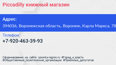 Piccadilly, книжный магазин по адресу 394036, Воронежская область, Воронеж, Карла Маркса, 78 в дальнейшем Организация, размещена в следующих категориях: