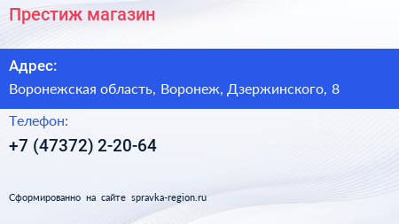 Престиж, магазин по адресу Воронежская область, Воронеж, Дзержинского, 8 в дальнейшем Организация, размещена в следующих категориях: