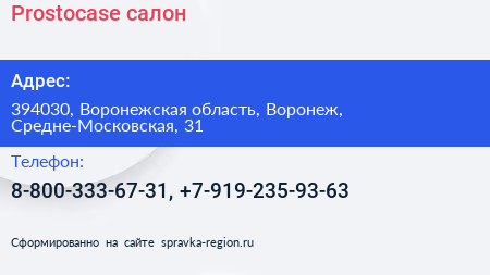 Prostocase, салон по адресу 394030, Воронежская область, Воронеж, Средне-Московская, 31 в дальнейшем Организация, размещена в следующих категориях: