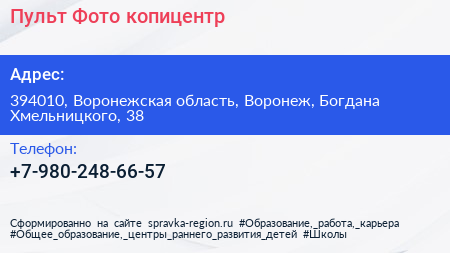 Пульт Фото, копицентр по адресу 394010, Воронежская область, Воронеж, Богдана Хмельницкого, 38 в дальнейшем Организация, размещена в следующих категориях: