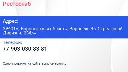 Рестоснаб по адресу 394016, Воронежская область, Воронеж, 45 Стрелковой Дивизии, 234/4 в дальнейшем Организация, размещена в следующих категориях: