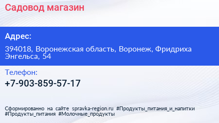 Садовод, магазин по адресу 394018, Воронежская область, Воронеж, Фридриха Энгельса, 54 в дальнейшем Организация, размещена в следующих категориях: