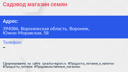 Садовод, магазин семян по адресу 394086, Воронежская область, Воронеж, Южно-Моравская, 58 в дальнейшем Организация, размещена в следующих категориях: