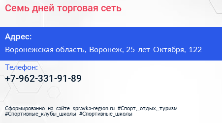 Семь дней, торговая сеть по адресу Воронежская область, Воронеж, 25 лет Октября, 122 в дальнейшем Организация, размещена в следующих категориях: