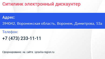 Ситилинк, электронный дискаунтер по адресу 394042, Воронежская область, Воронеж, Димитрова, 53а в дальнейшем Организация, размещена в следующих категориях: