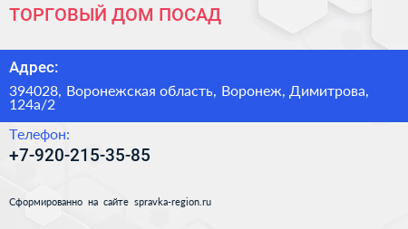 ТОРГОВЫЙ ДОМ ПОСАД по адресу 394028, Воронежская область, Воронеж, Димитрова, 124а/2 в дальнейшем Организация, размещена в следующих категориях: