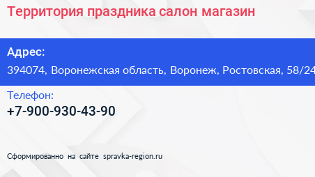 Территория праздника, салон-магазин по адресу 394074, Воронежская область, Воронеж, Ростовская, 58/24 в дальнейшем Организация, размещена в следующих категориях: