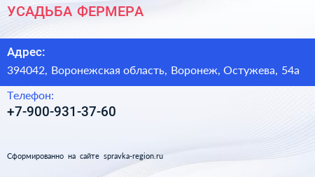 УСАДЬБА ФЕРМЕРА по адресу 394042, Воронежская область, Воронеж, Остужева, 54а в дальнейшем Организация, размещена в следующих категориях: