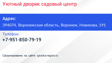 Уютный дворик, садовый центр по адресу 394074, Воронежская область, Воронеж, Новикова, 191 в дальнейшем Организация, размещена в следующих категориях: