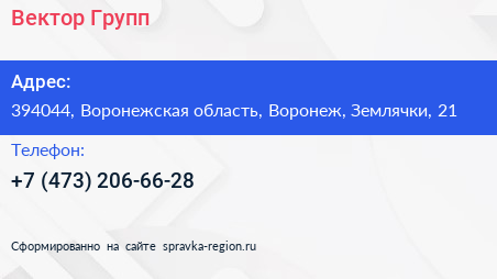 Вектор Групп по адресу 394044, Воронежская область, Воронеж, Землячки, 21 в дальнейшем Организация, размещена в следующих категориях: