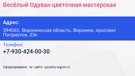 Весёлый Одуван, цветочная мастерская по адресу 394065, Воронежская область, Воронеж, проспект Патриотов, 23е в дальнейшем Организация, размещена в следующих категориях: