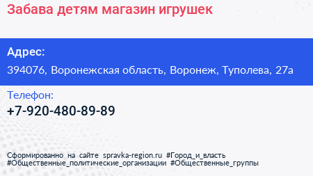 Забава детям, магазин игрушек по адресу 394076, Воронежская область, Воронеж, Туполева, 27а в дальнейшем Организация, размещена в следующих категориях: