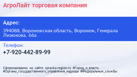 АгроЛайт, торговая компания по адресу 394088, Воронежская область, Воронеж, Генерала Лизюкова, 66а в дальнейшем Организация, размещена в следующих категориях: