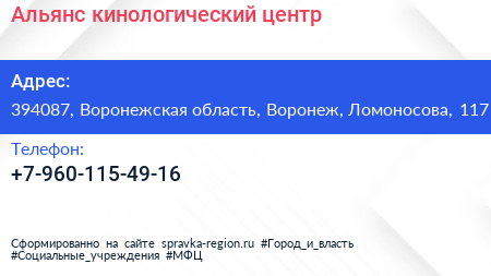 Альянс, кинологический центр по адресу 394087, Воронежская область, Воронеж, Ломоносова, 117 в дальнейшем Организация, размещена в следующих категориях: