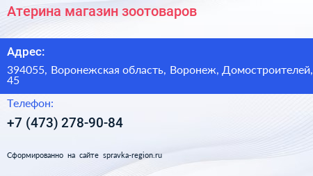 Атерина, магазин зоотоваров по адресу 394055, Воронежская область, Воронеж, Домостроителей, 45 в дальнейшем Организация, размещена в следующих категориях: