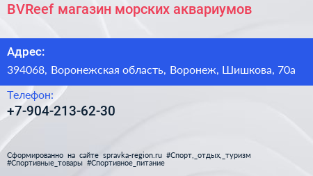 BVReef, магазин морских аквариумов по адресу 394068, Воронежская область, Воронеж, Шишкова, 70а в дальнейшем Организация, размещена в следующих категориях: