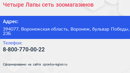 Четыре Лапы, сеть зоомагазинов по адресу 394077, Воронежская область, Воронеж, бульвар Победы, 23Б в дальнейшем Организация, размещена в следующих категориях: