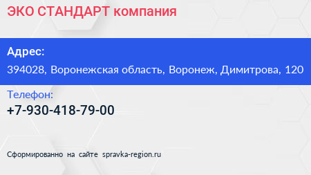 ЭКО СТАНДАРТ, компания по адресу 394028, Воронежская область, Воронеж, Димитрова, 120 в дальнейшем Организация, размещена в следующих категориях: