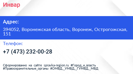 Инвар по адресу 394052, Воронежская область, Воронеж, Острогожская, 151 в дальнейшем Организация, размещена в следующих категориях: