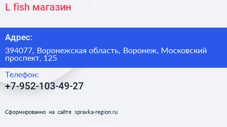 L-fish, магазин по адресу 394077, Воронежская область, Воронеж, Московский проспект, 125 в дальнейшем Организация, размещена в следующих категориях: