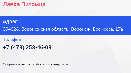 Лавка Питомца по адресу 394026, Воронежская область, Воронеж, Еремеева, 17а в дальнейшем Организация, размещена в следующих категориях: