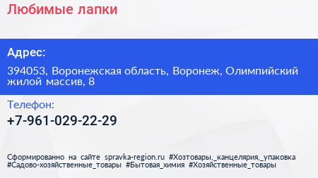 Любимые лапки по адресу 394053, Воронежская область, Воронеж, Олимпийский жилой массив, 8 в дальнейшем Организация, размещена в следующих категориях: