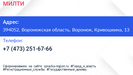 МИЛТИ по адресу 394052, Воронежская область, Воронеж, Кривошеина, 13 в дальнейшем Организация, размещена в следующих категориях: