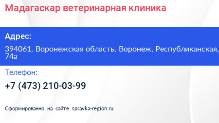 Мадагаскар, ветеринарная клиника по адресу 394061, Воронежская область, Воронеж, Республиканская, 74а в дальнейшем Организация, размещена в следующих категориях: