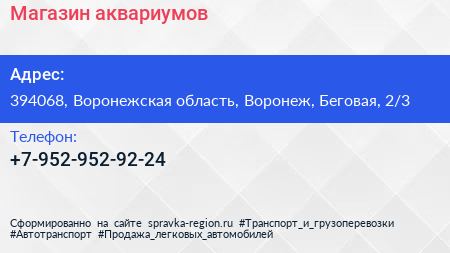 Магазин аквариумов по адресу 394068, Воронежская область, Воронеж, Беговая, 2/3 в дальнейшем Организация, размещена в следующих категориях: