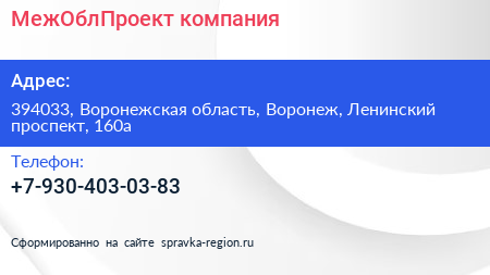 МежОблПроект, компания по адресу 394033, Воронежская область, Воронеж, Ленинский проспект, 160а в дальнейшем Организация, размещена в следующих категориях: