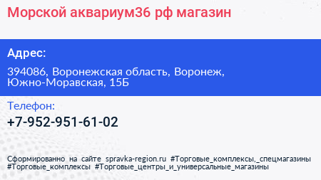 Морской-аквариум36.рф, магазин по адресу 394086, Воронежская область, Воронеж, Южно-Моравская, 15Б в дальнейшем Организация, размещена в следующих категориях: