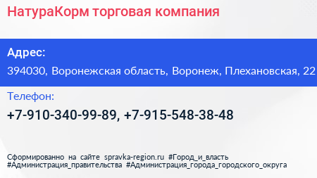 НатураКорм, торговая компания по адресу 394030, Воронежская область, Воронеж, Плехановская, 22 в дальнейшем Организация, размещена в следующих категориях: