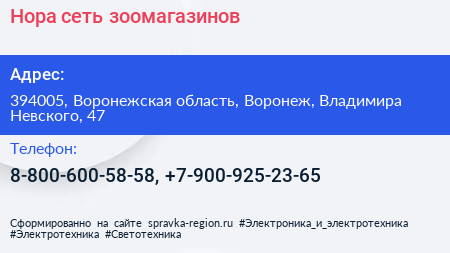 Нора, сеть зоомагазинов по адресу 394005, Воронежская область, Воронеж, Владимира Невского, 47 в дальнейшем Организация, размещена в следующих категориях: