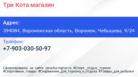Три Кота, магазин по адресу 394084, Воронежская область, Воронеж, Чебышева, 9/24 в дальнейшем Организация, размещена в следующих категориях: