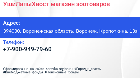 УшиЛапыХвост, магазин зоотоваров по адресу 394030, Воронежская область, Воронеж, Кропоткина, 13а в дальнейшем Организация, размещена в следующих категориях: