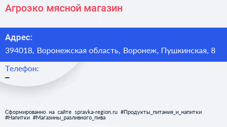 Агроэко, мясной магазин по адресу 394018, Воронежская область, Воронеж, Пушкинская, 8 в дальнейшем Организация, размещена в следующих категориях: