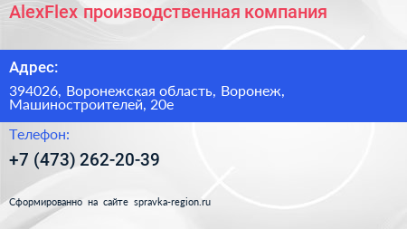 AlexFlex, производственная компания по адресу 394026, Воронежская область, Воронеж, Машиностроителей, 20е в дальнейшем Организация, размещена в следующих категориях: