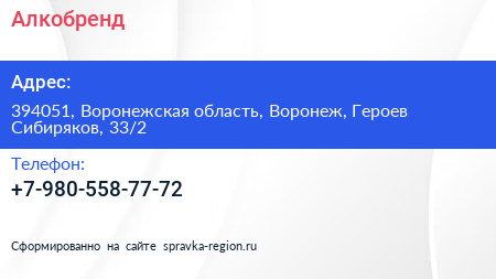 Алкобренд по адресу 394051, Воронежская область, Воронеж, Героев Сибиряков, 33/2 в дальнейшем Организация, размещена в следующих категориях: