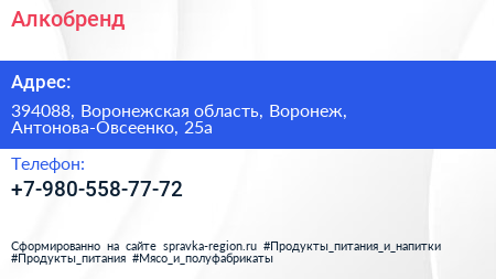 Алкобренд по адресу 394088, Воронежская область, Воронеж, Антонова-Овсеенко, 25а в дальнейшем Организация, размещена в следующих категориях:
