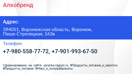 Алкобренд по адресу 394051, Воронежская область, Воронеж, Пеше-Стрелецкая, 163в в дальнейшем Организация, размещена в следующих категориях: