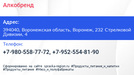 Алкобренд по адресу 394040, Воронежская область, Воронеж, 232 Стрелковой Дивизии, 4 в дальнейшем Организация, размещена в следующих категориях: