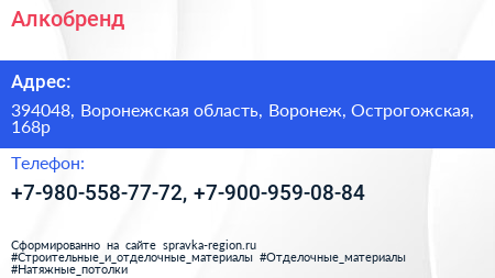 Алкобренд по адресу 394048, Воронежская область, Воронеж, Острогожская, 168р в дальнейшем Организация, размещена в следующих категориях: